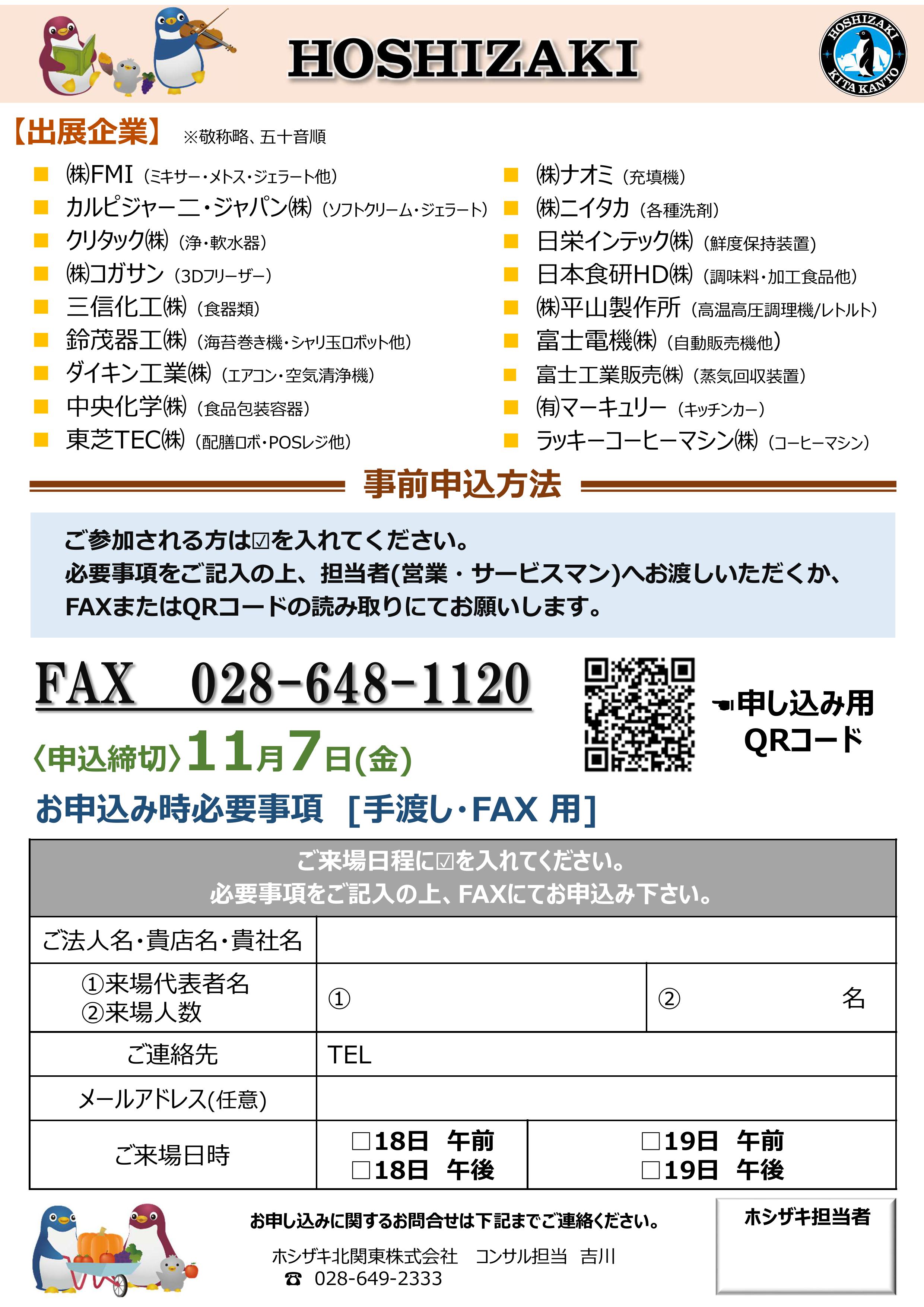 ホシザキ新製品をはじめ、食品関連企業約20社の機器や食材ご案内など、